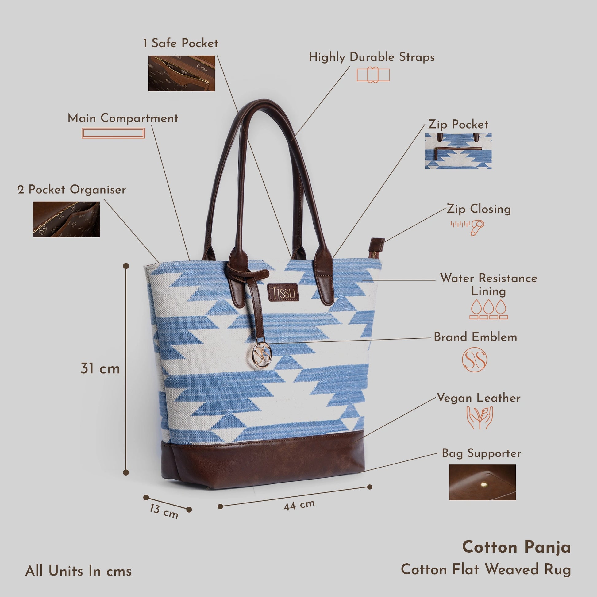 View compareMountain Mist Blue Geometric Tote Bag with Brown Leather Base | Handwoven Everyday Shoulder Bag