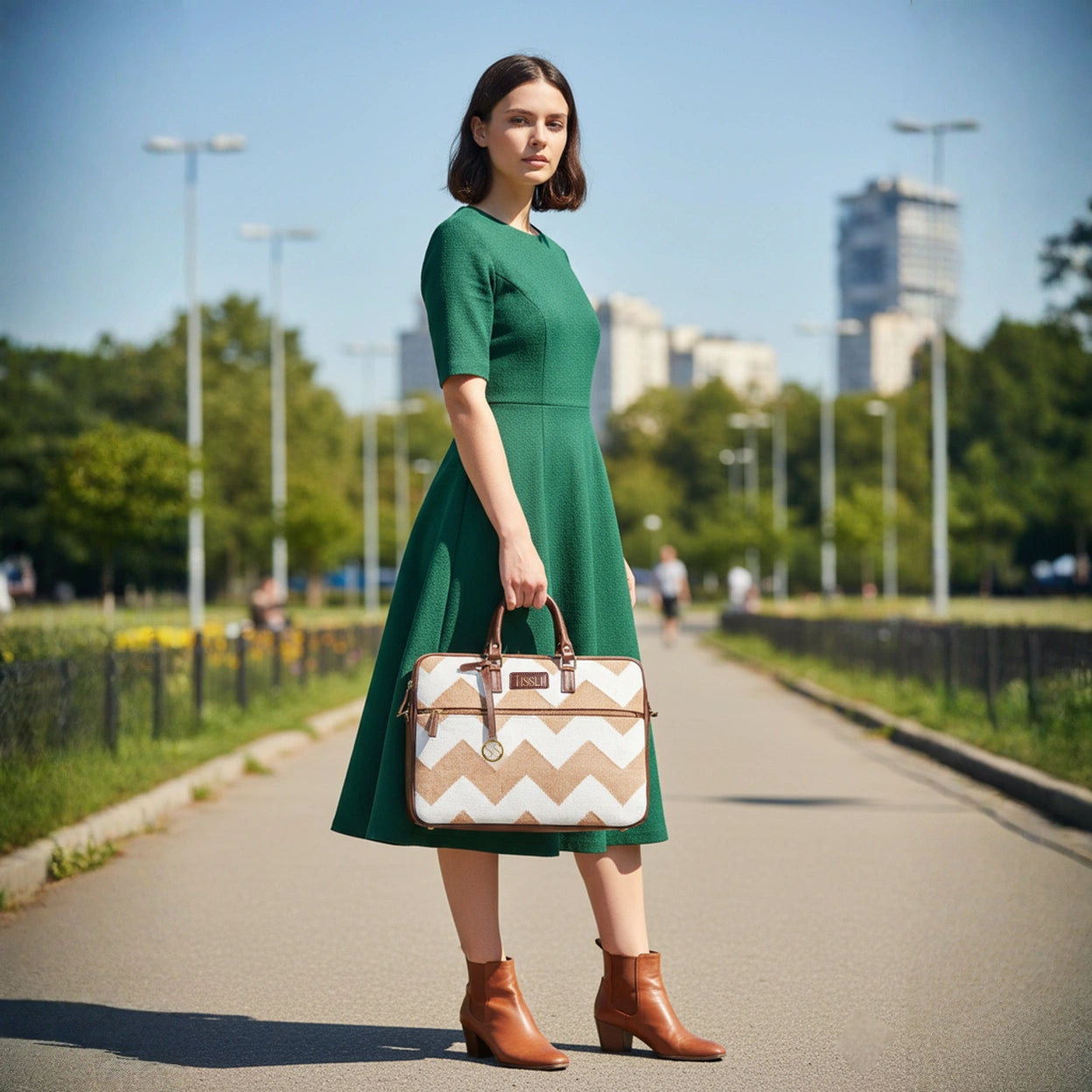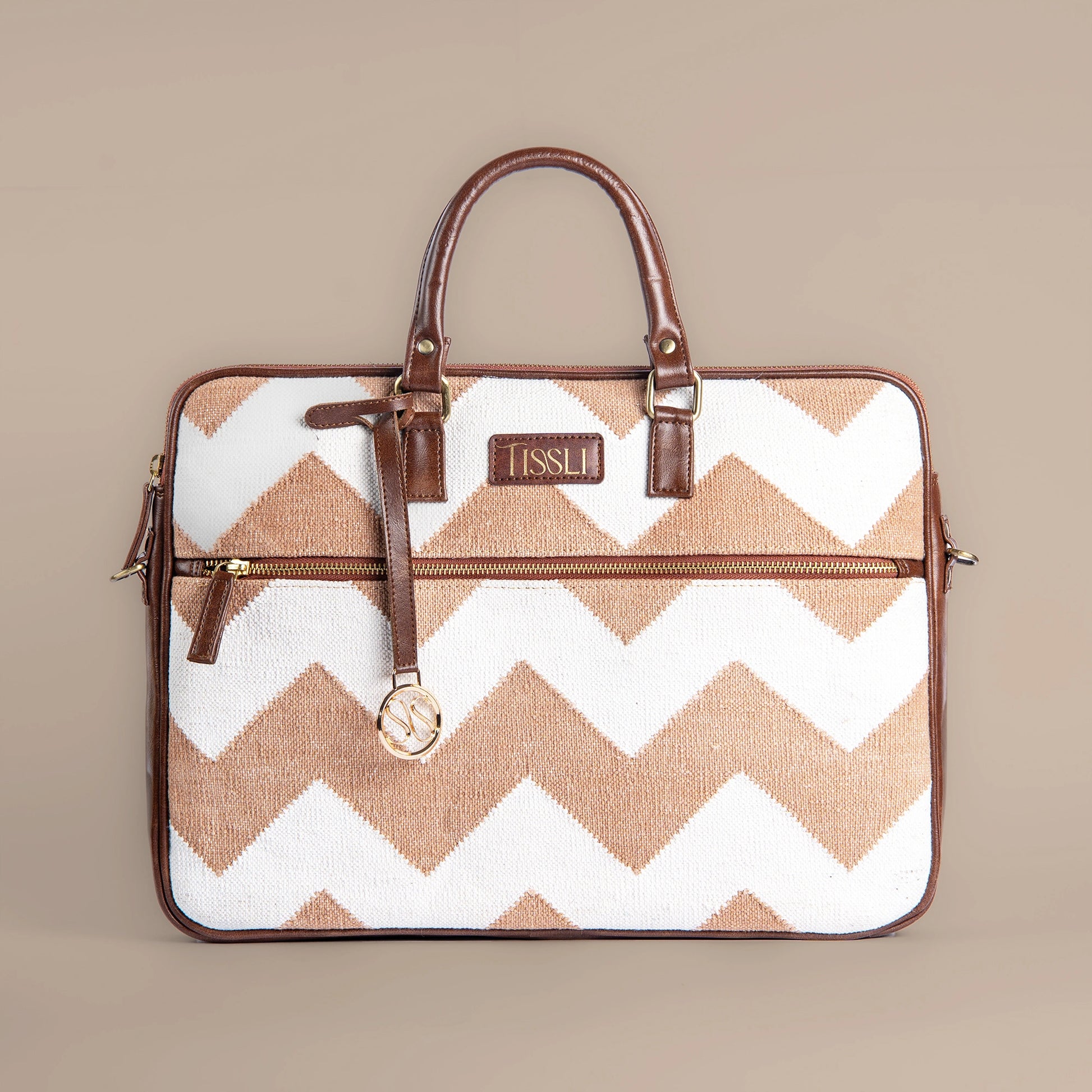 Desert Dunes Beige Chevron Laptop Bag with Brown Leather Handles | Handwoven Office & Travel Bag