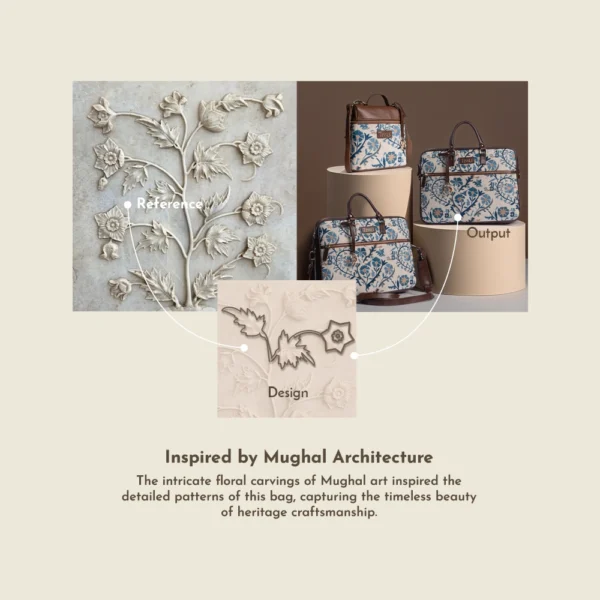 Inspired by Mughal Architecture The intricate floral carvings of Mughal art inspired the detailed patterns of this bag, capturing the timeless beauty of heritage craftsmanship. Explore the craftsmanship and weaving traditions that shape every handcrafted Tissli bag.