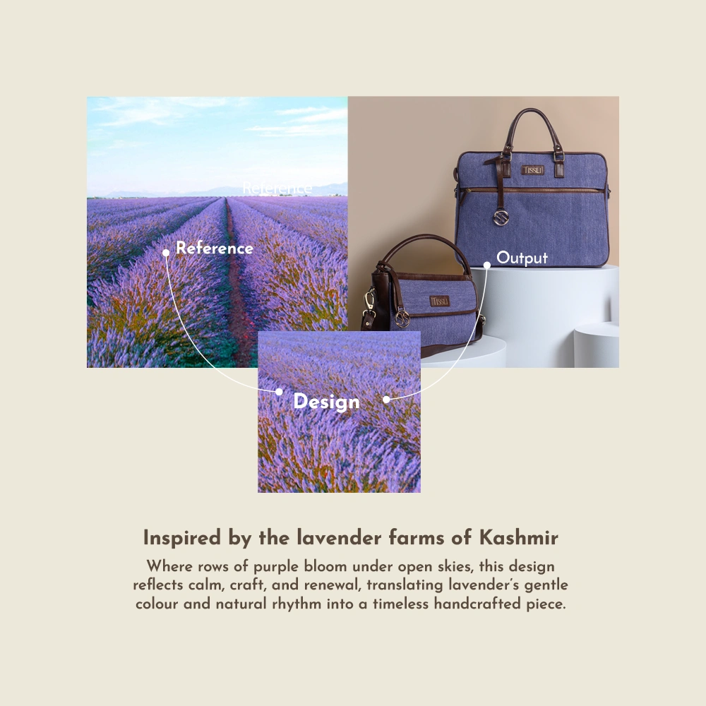 Inspired by the Lavender farms of Kashmir Where rows of purple bloom under open skies, this design reflects calm, craft, and renewal, translating lavender’s gentle colour and natural rhythm into a timeless handcrafted piece.