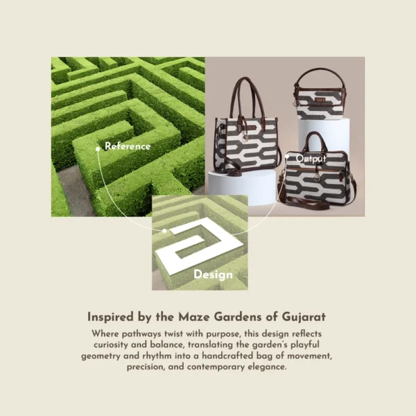 Inspired by the Maze Gardens of Gujarat Where pathways twist with purpose, this design reflects curiosity and balance, translating the garden’s playful geometry and rhythm into a handcrafted bag of movement, precision, and contemporary elegance. Learn how Tissli blends Indian craftsmanship with modern design to create ethical handcrafted bags.