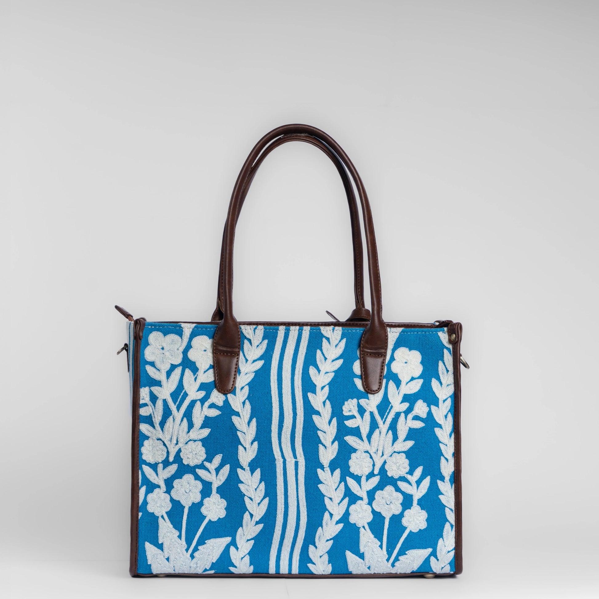 Chikankari Grace Tote Bag | Elegant handcrafted tote with white floral embroidery on a blue base