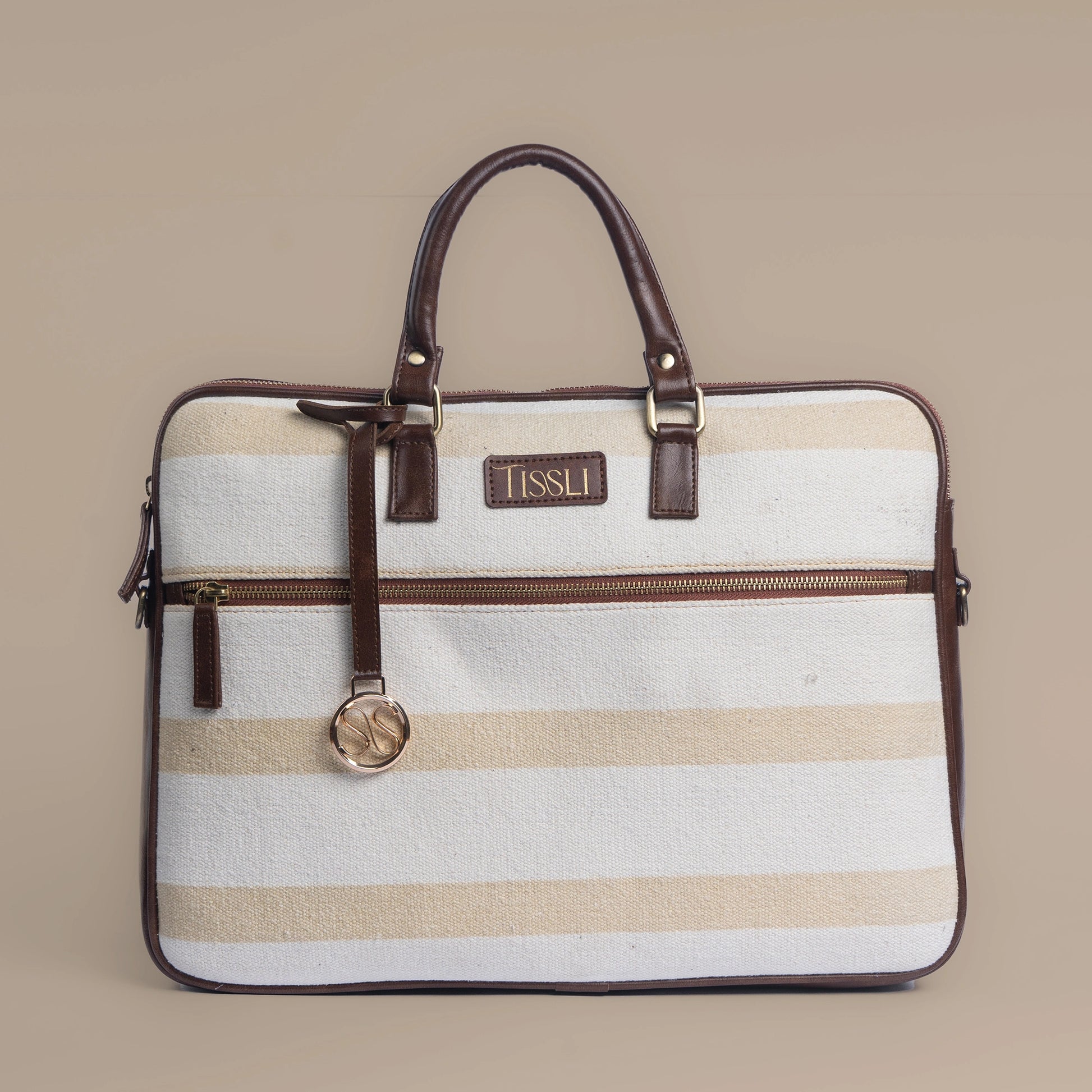 Desert Drift Beige Stripe Laptop Bag with Brown Leather Handles | Handwoven Office & Travel Bag