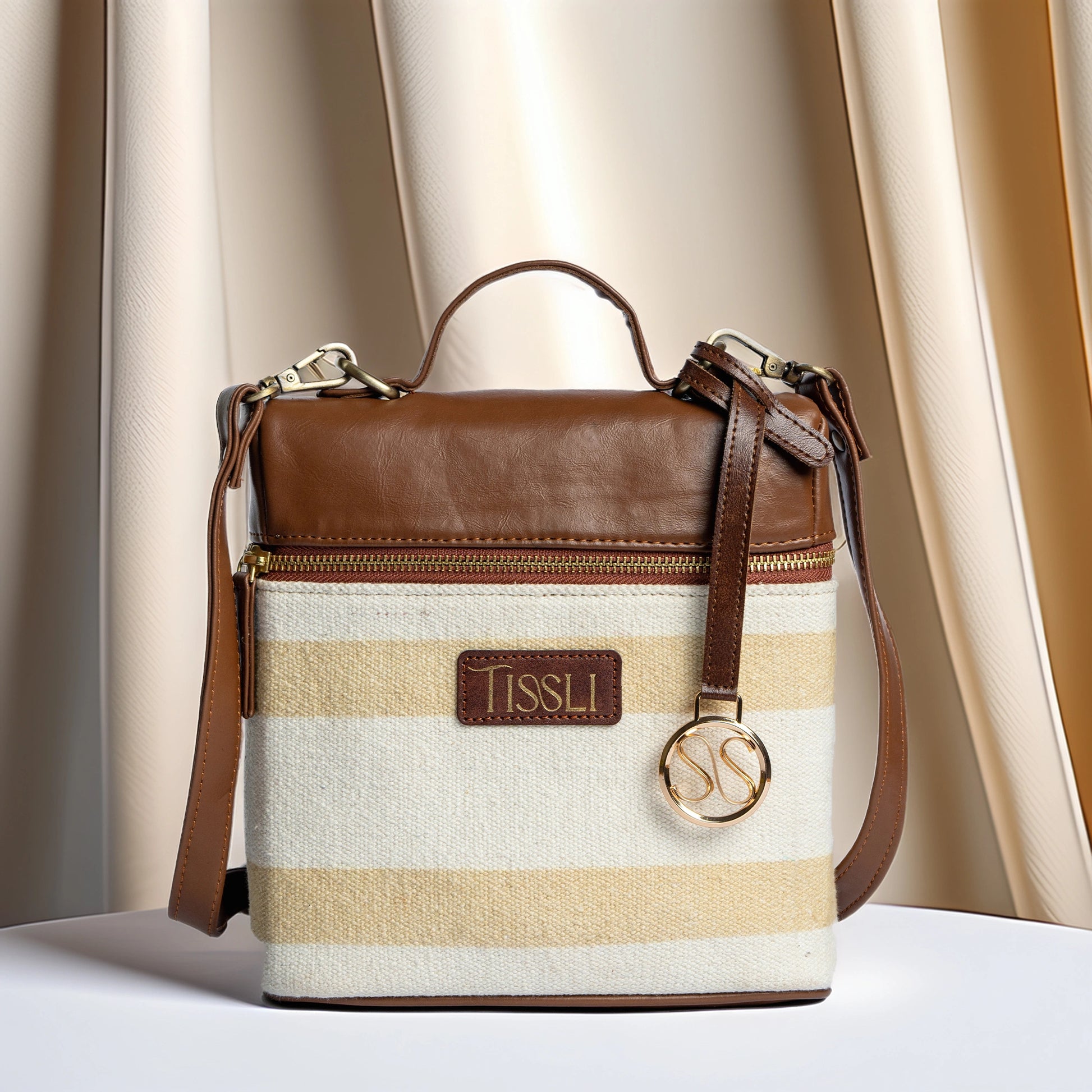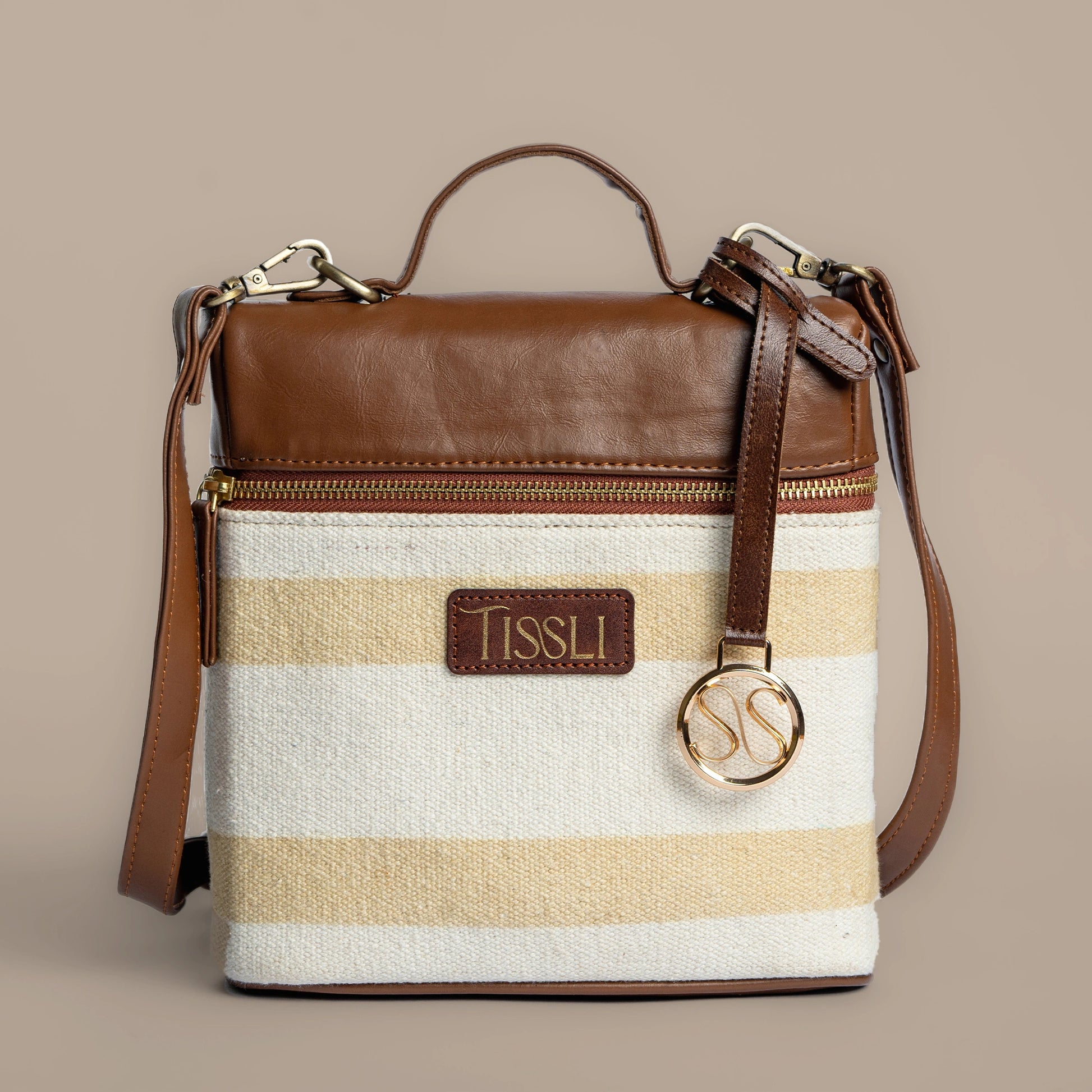 Desert Drift Beige Stripe Cross Body Bag with Tan Leather Finish | Handwoven Everyday Sling Bag