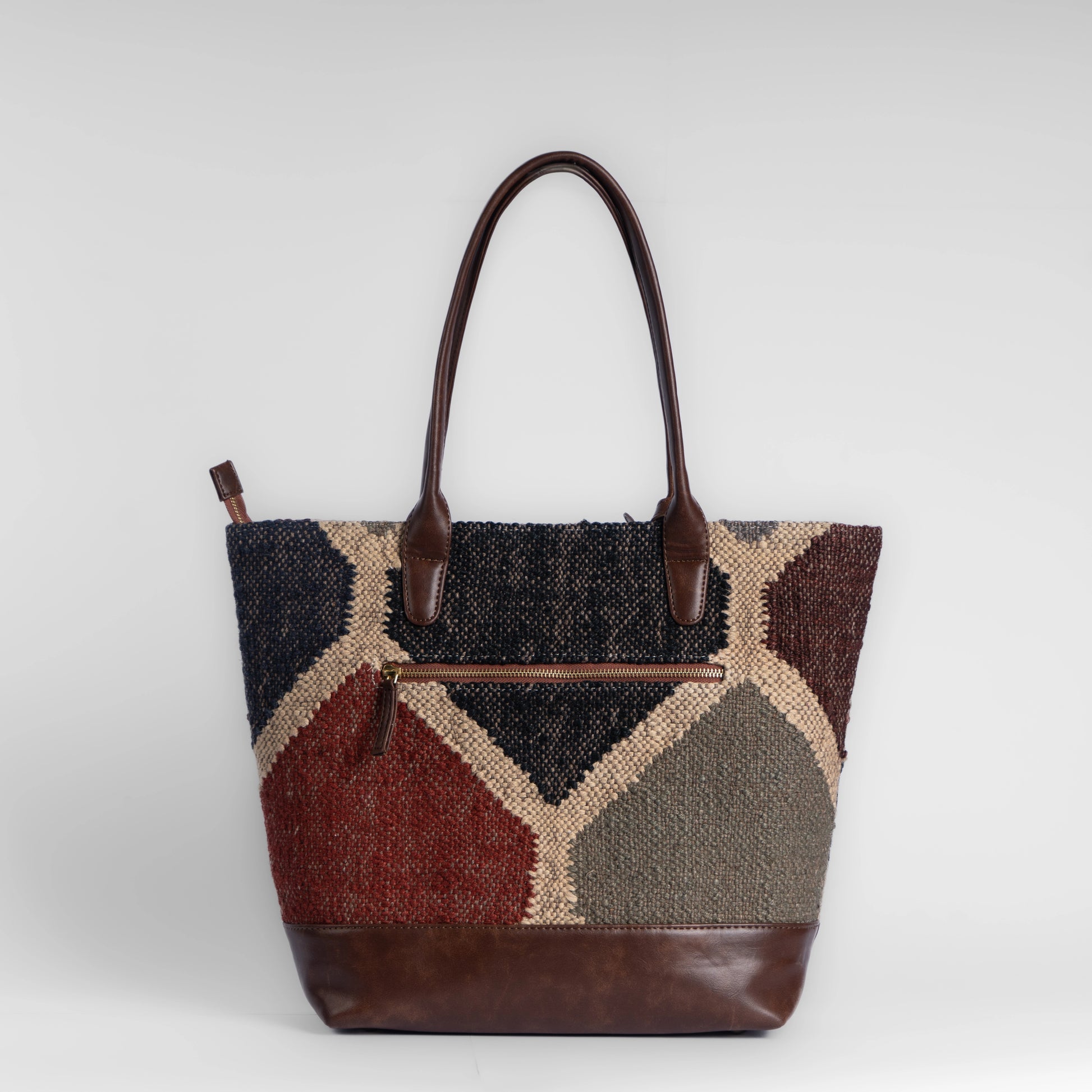 Mountain Mist Blue Geometric Tote Bag with Brown Leather Base | Handwoven Everyday Shoulder Bag