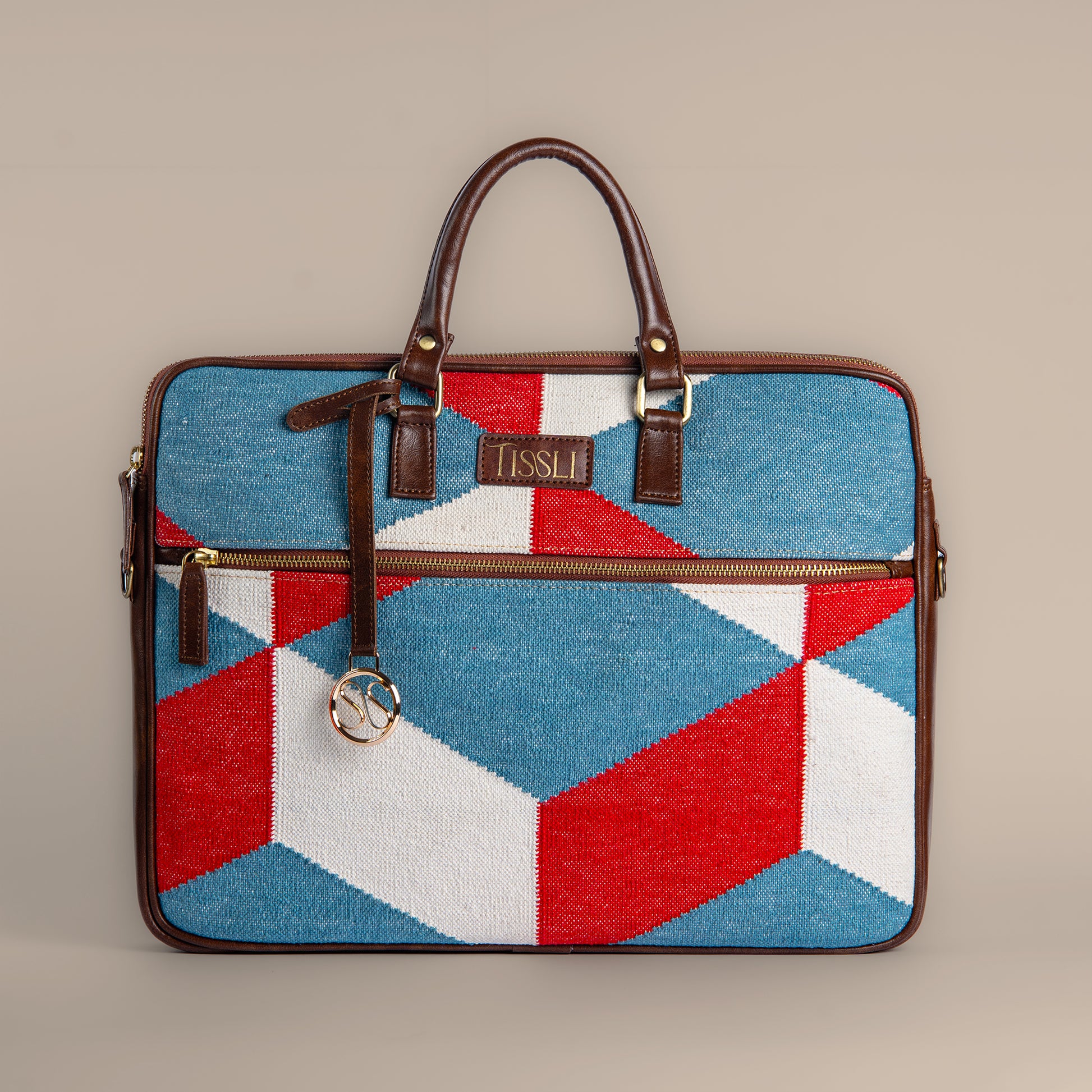 Handwoven Illusionist Laptop Bag with Brown Leather Handles | Bold Geometric Design for Work and Everyday Use