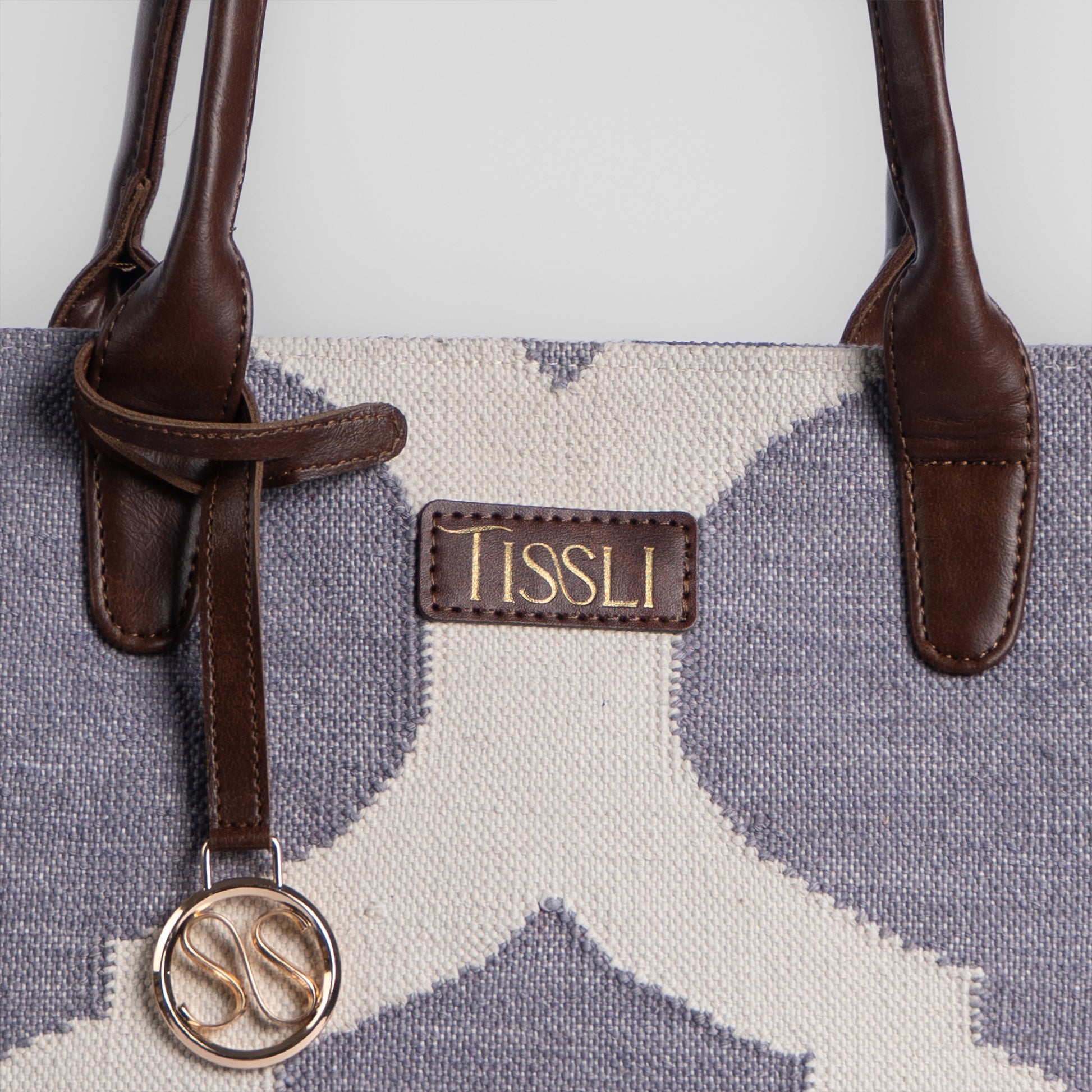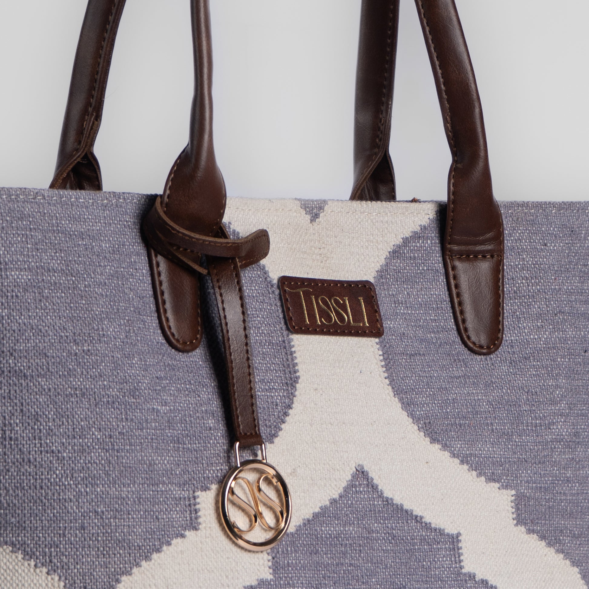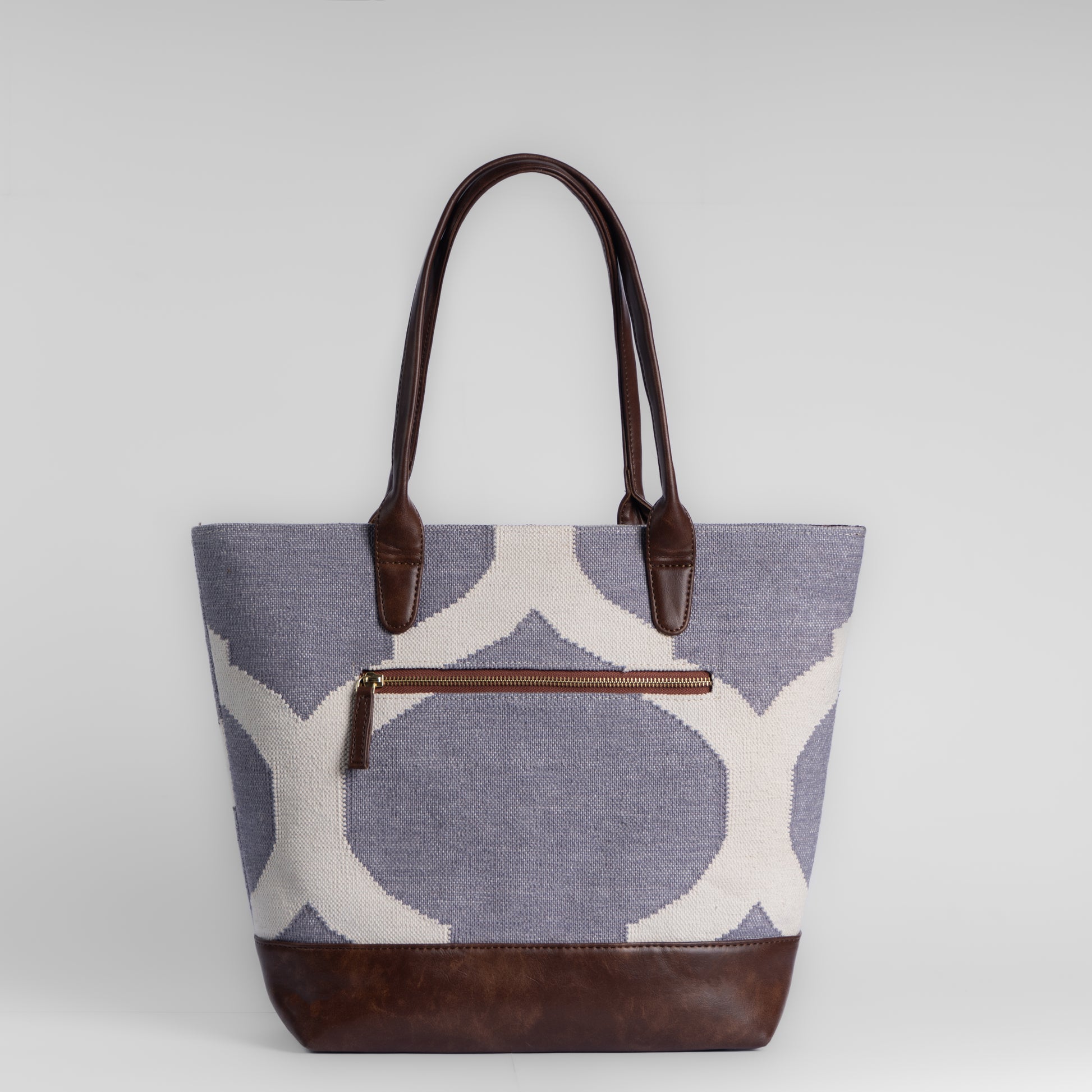 Mountain Mist Blue Geometric Tote Bag with Brown Leather Base | Handwoven Everyday Shoulder Bag
